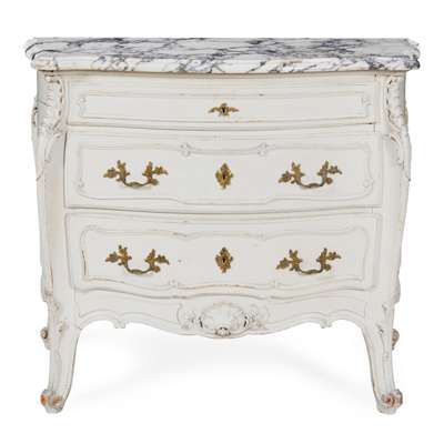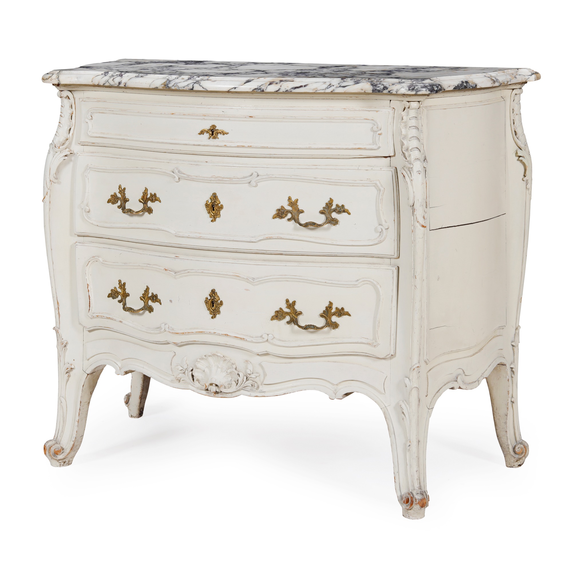 FRENCH MARBLE TOPPED CREAM PAINTED WOOD SERPENTINE COMMODE