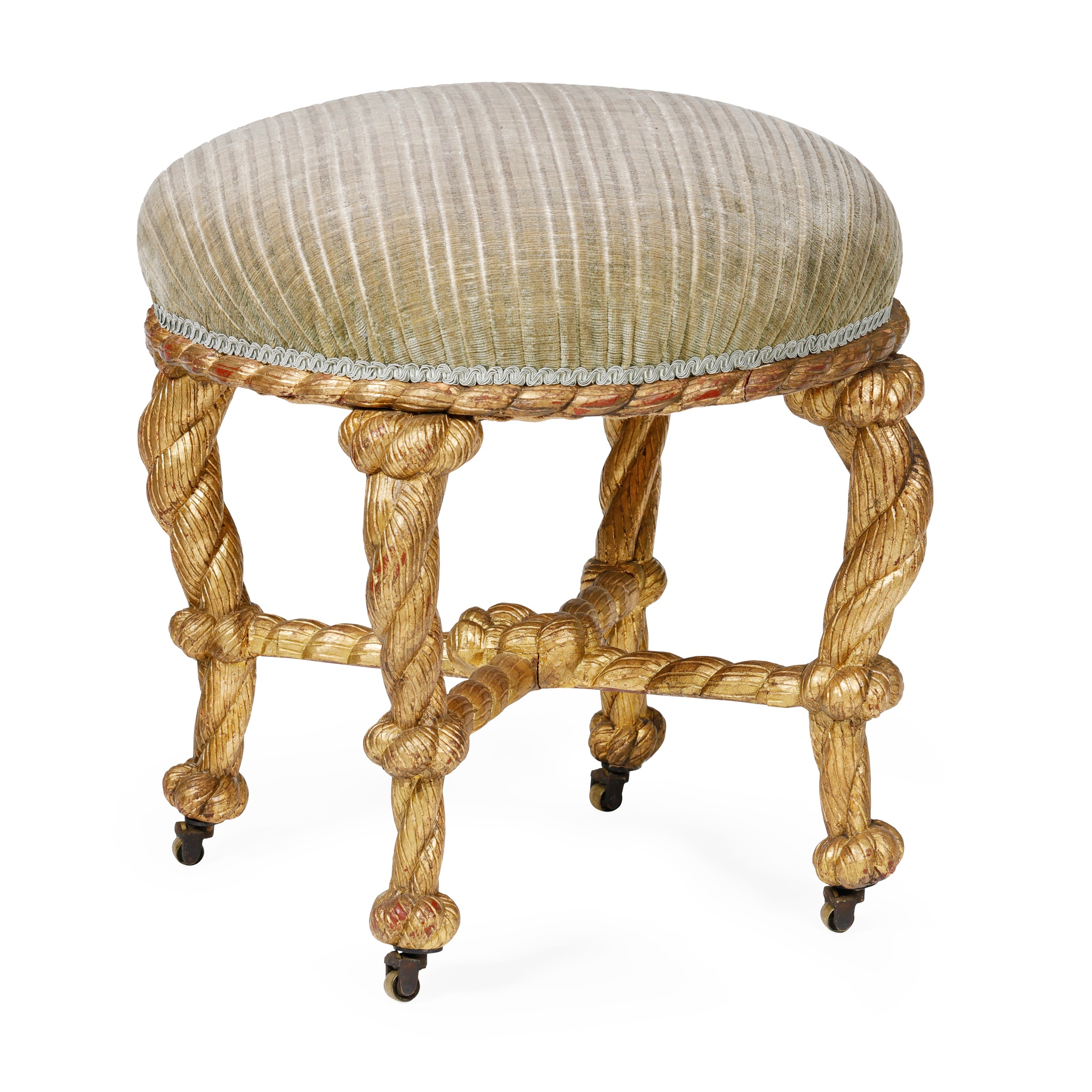 with circular upholstered seat, of rope-twist form on castors