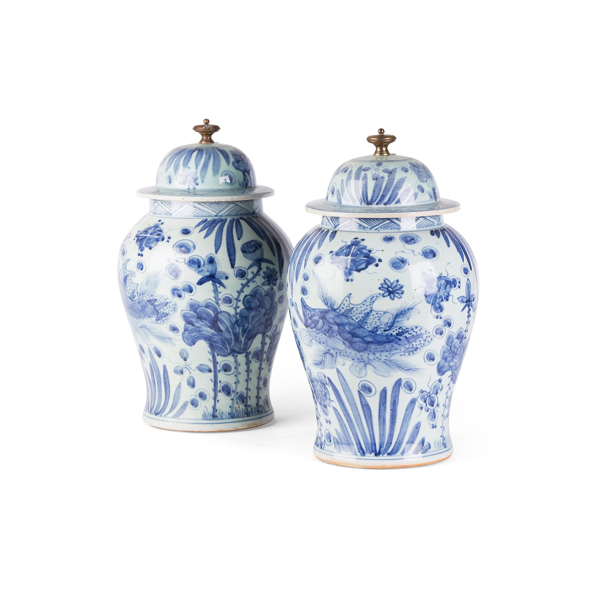 both decorated with two fish to each sides, surrounded by lotus flowers, the lid topped with a metal finial