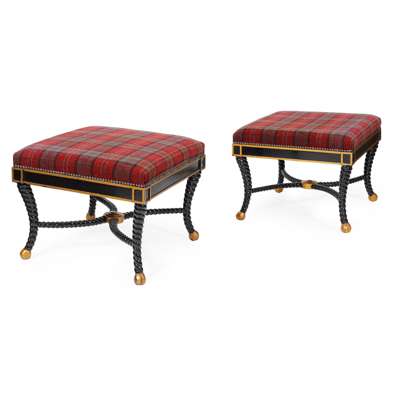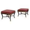 PAIR OF FRENCH EBONIZED AND GILT WOOD FRAMED SQUARE STOOLS