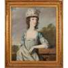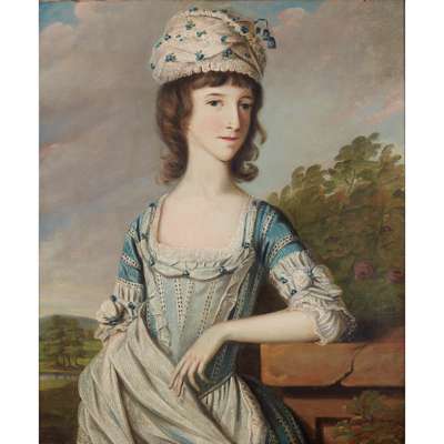 PORTRAIT OF A YOUNG WOMAN IN BLUE AND WHITE DRESS AND HAT