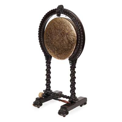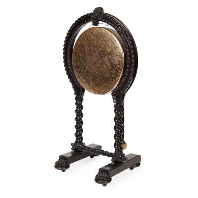 CARVED AND STAINED OAK AND BRASS DINNER GONG