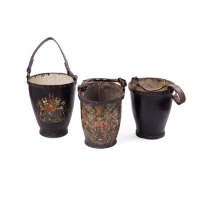 THREE GEORGIAN PAINTED LEATHER FIRE BUCKETS