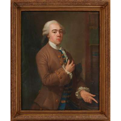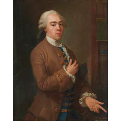 THREE QUARTER LENGTH PORTRAIT OF A YOUNG MAN IN BROWN FROCK COAT AND BLUE WAISTCOAT