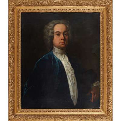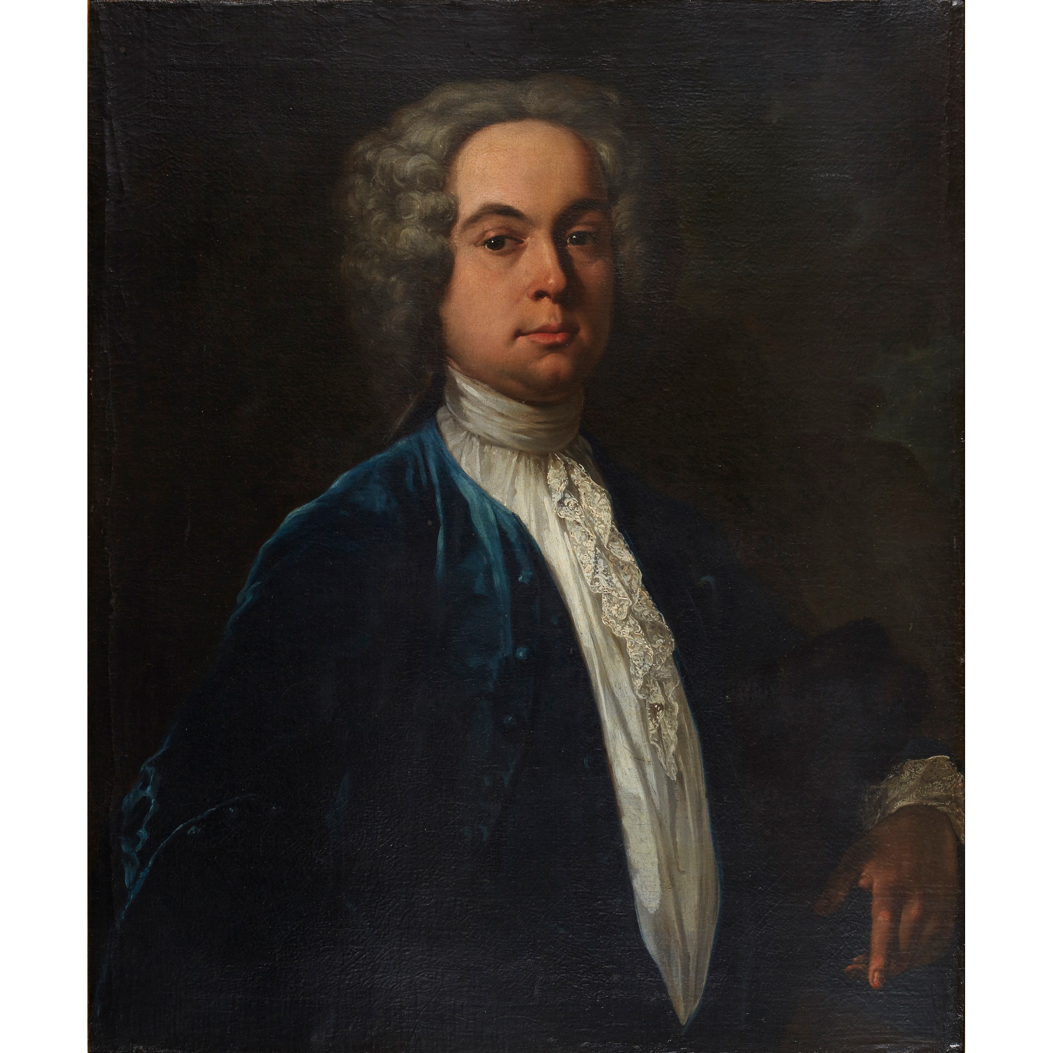 HALF LENGTH PORTRAIT OF A GENTLEMAN IN A BLUE JACKET AND WHITE LACE JABOT