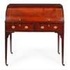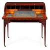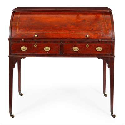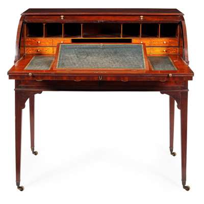 the rectangular top above cylinder enclosing a pull out green leather writing surface, with adjustable slope, an arrangement of satinwood drawers and pigeonholes, with two frieze drawers, on square tapering legs, brass caps and castors