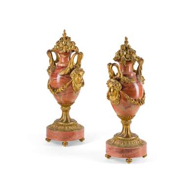 PAIR OF FRENCH PINK VEINED MARBLE AND GILT BRONZE URNS