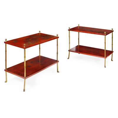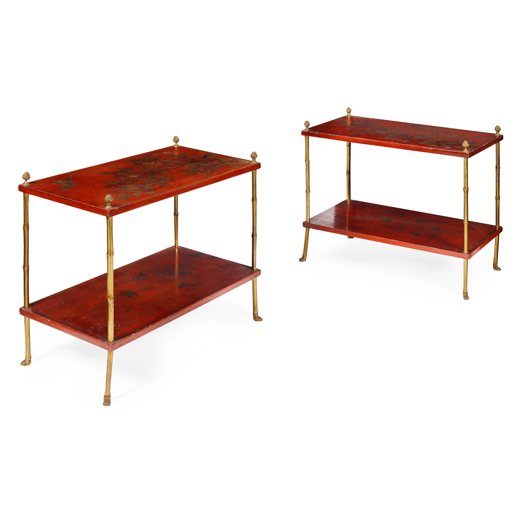 PAIR OF BRASS FRAMED RED LACQUER ÉTAGÈRES