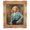 THREE QUARTER LENGTH PORTRAIT OF A BLONDE WOMAN IN BLUE BLOUSE