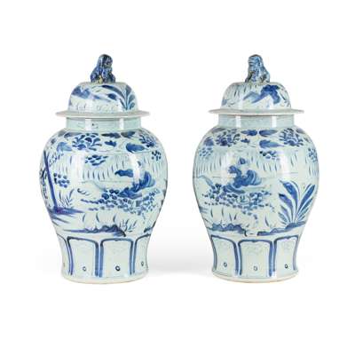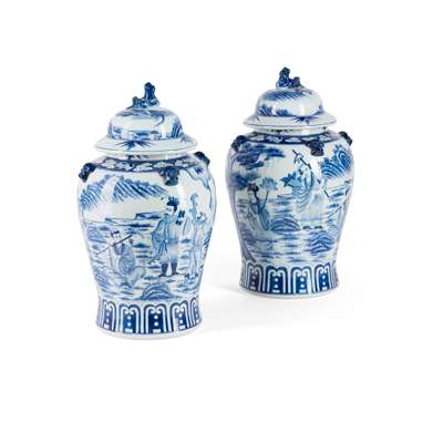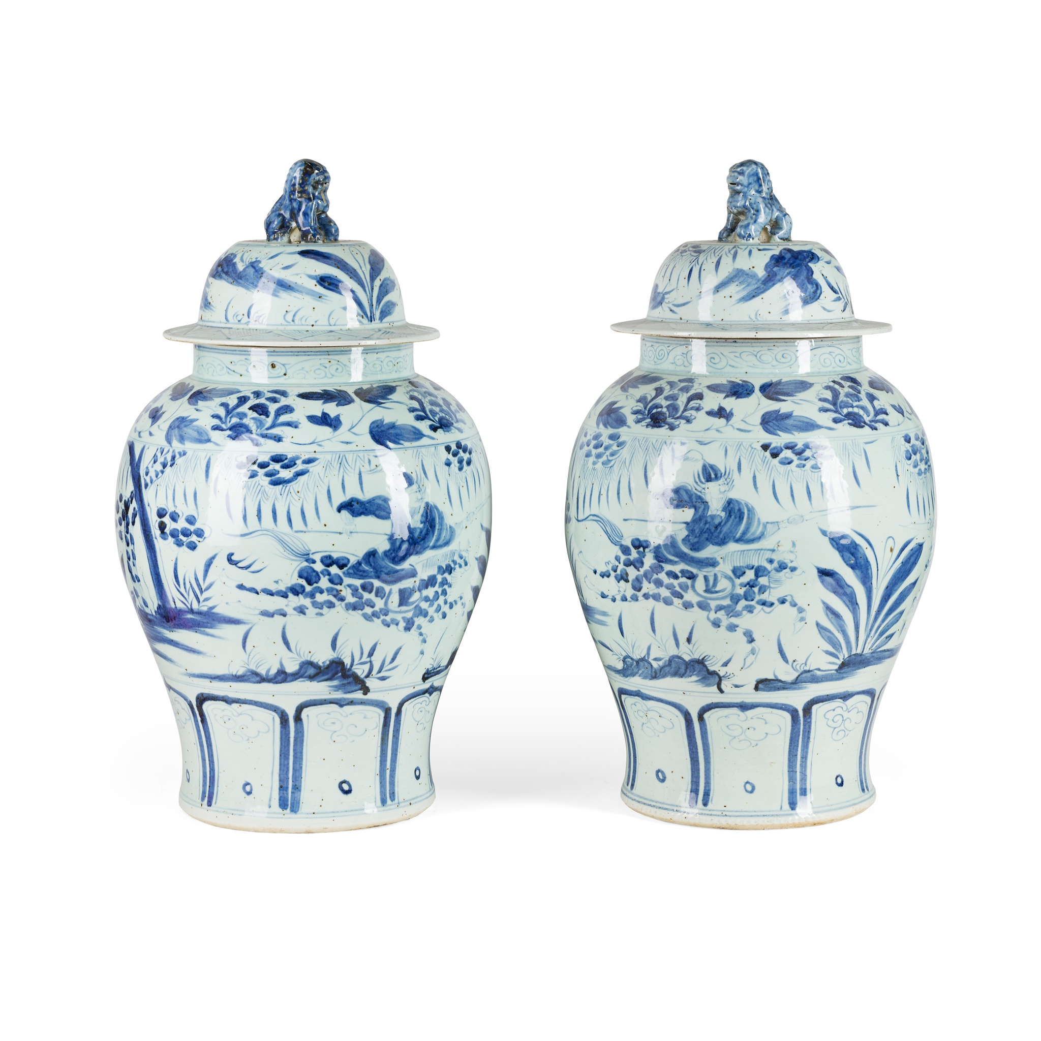 each painted with figures on horseback, topped with a mythical creature as finial on the lid; together with a SMALLER PAIR OF BLUE AND WHITE COVERED JARS, each painted with the Eight Immortals in a garden, one of the bases inscribed with 'Ruo Shen Zhen Cang'