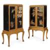 each with panels depicting Chinese figures in domestic scenes, enclosing shelves, on cabriole legs