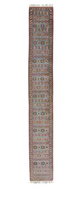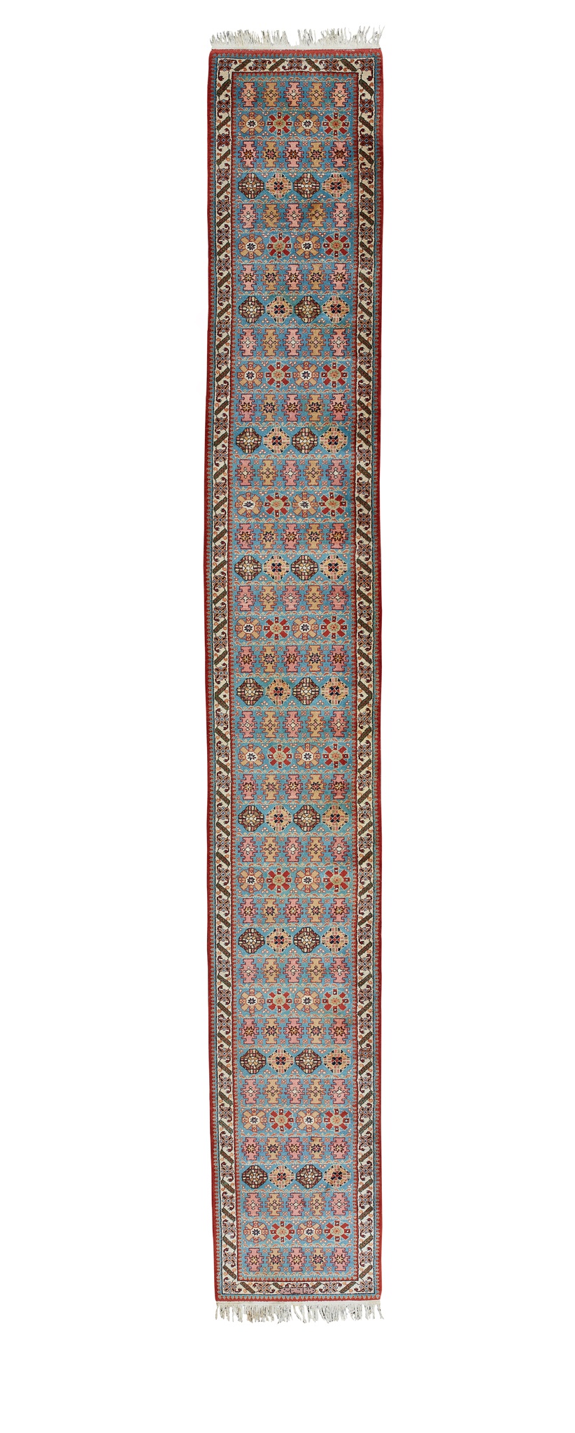the light blue field with rows of geometric motifs, within ivory stylised vine border