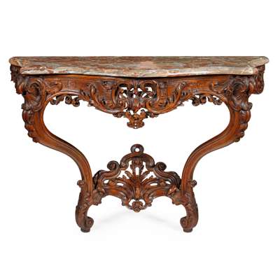 CONTINENTAL MARBLE TOPPED CARVED WALNUT CONSOLE TABLE
