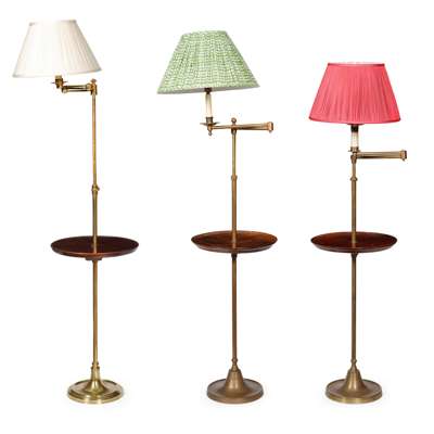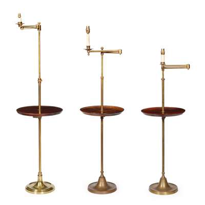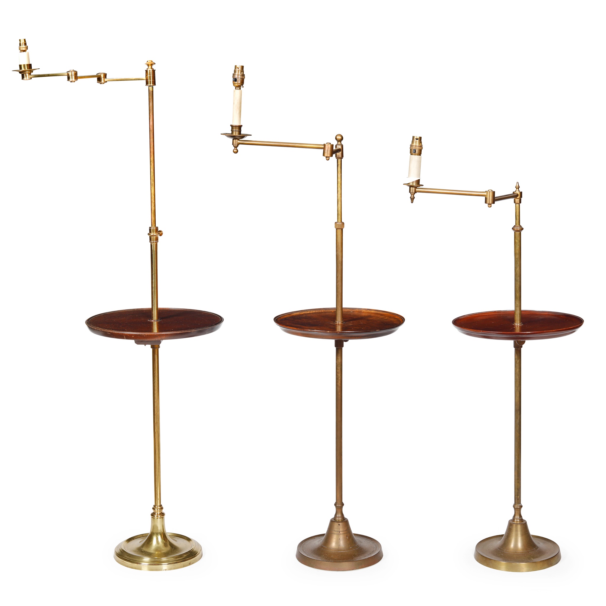 each with dished tray on splayed bases; together with ANOTHER SIMILAR LAMP
