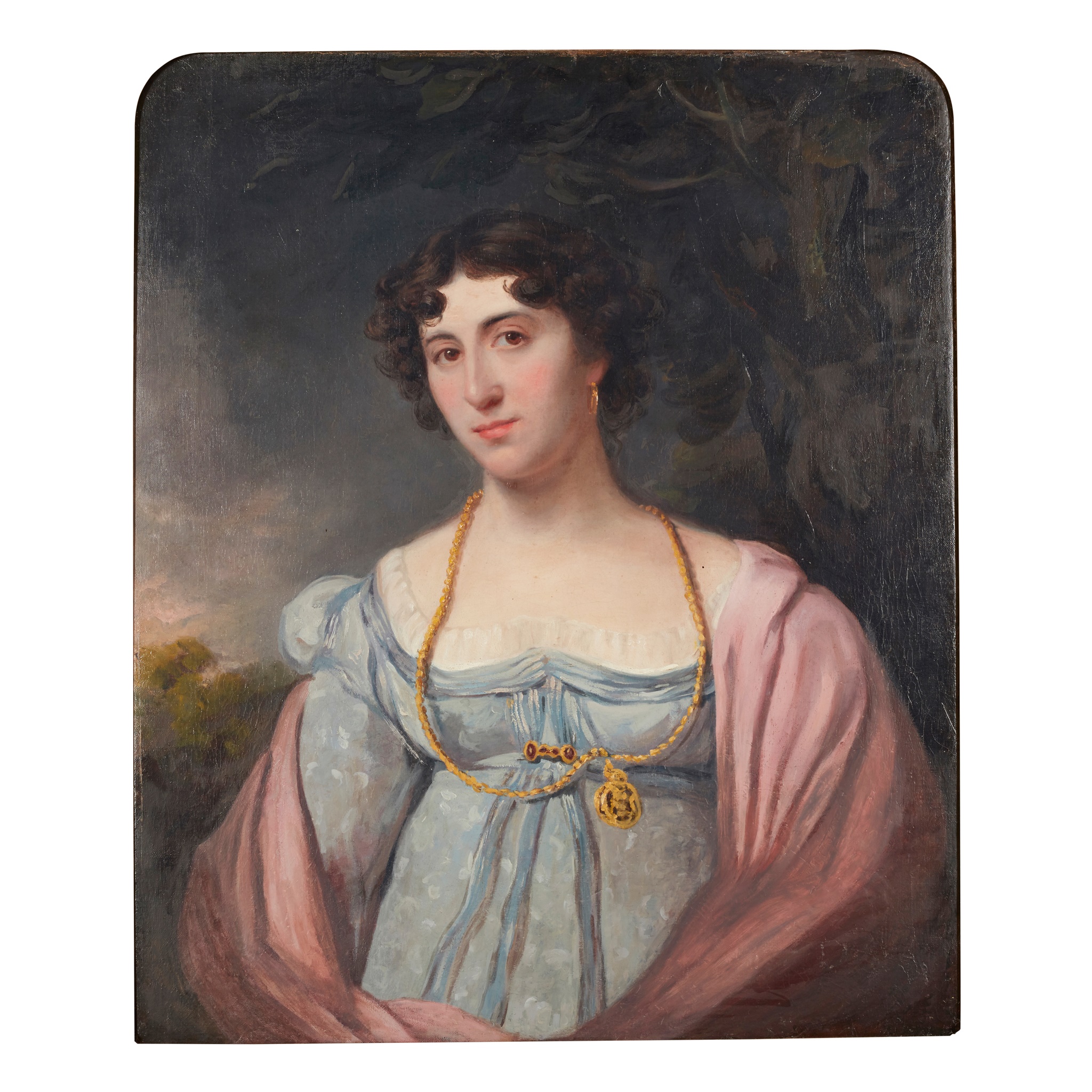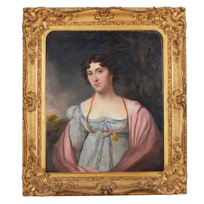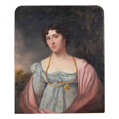 HALF LENGTH PORTRAIT OF A YOUNG WOMAN WEARING A LOCKET