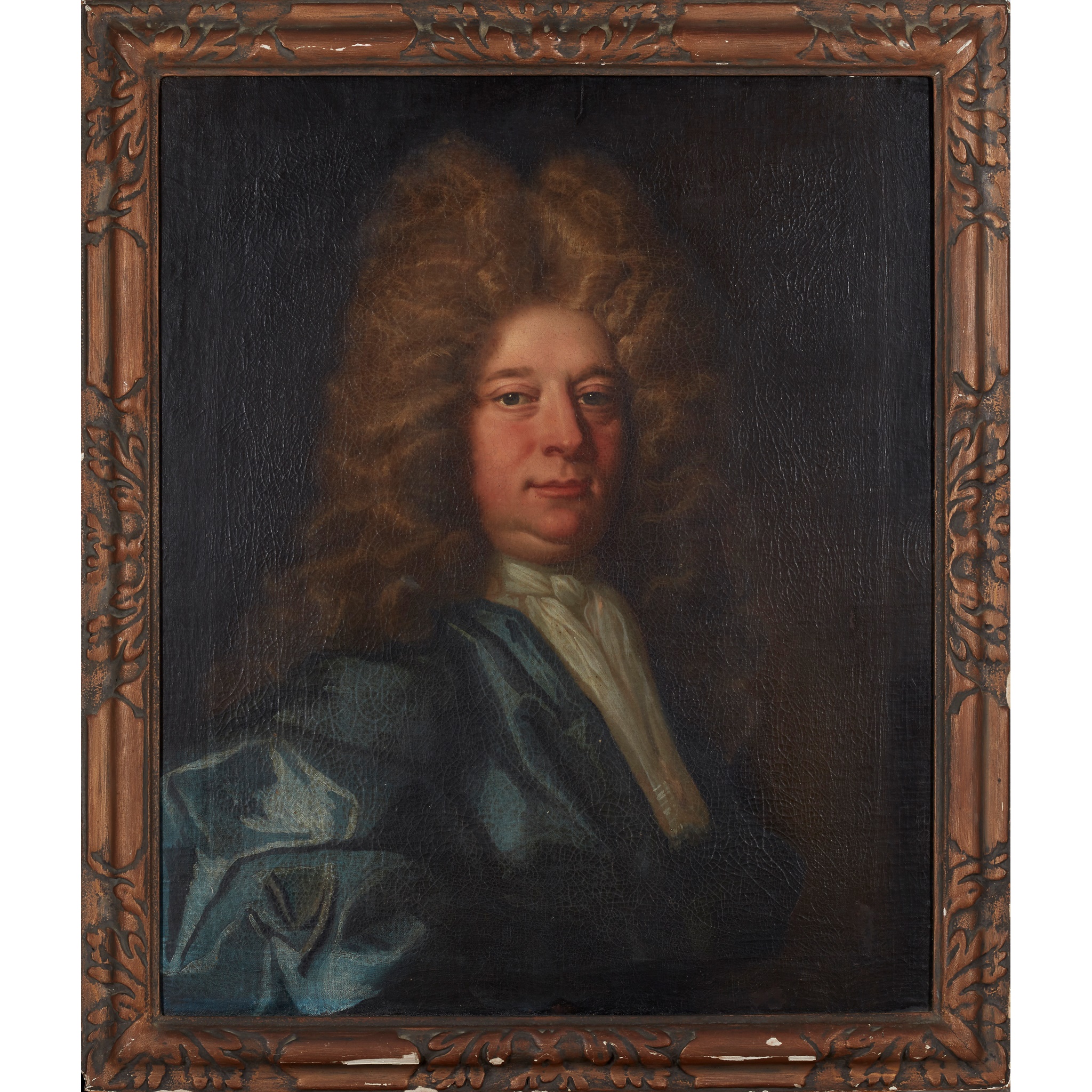 HEAD AND SHOULDER PORTRAIT OF A BEWIGGED GENTLEMAN WITH A BLUE CLOAK AND WHITE STOCK