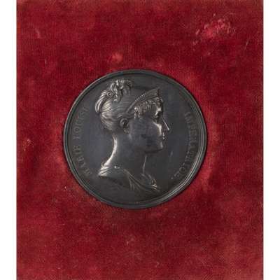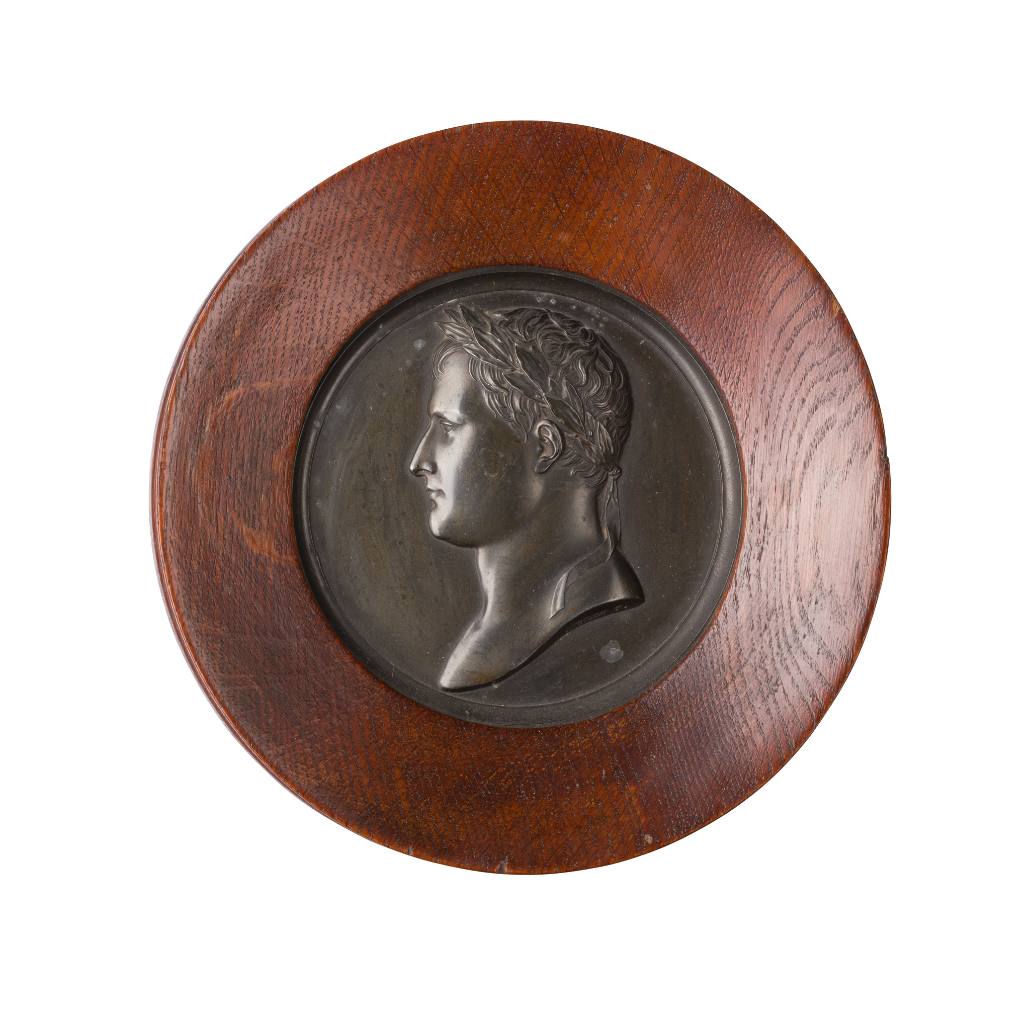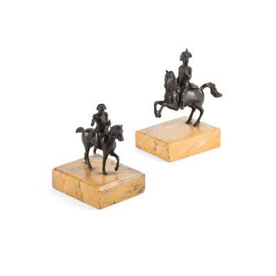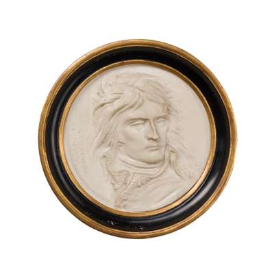 including: a Napoleon portrait roundel after Andrieu; another Napoleon roundel; a pair of bronze equestrian figures of Napoleon and the Duke of Wellington; and a silvered metal medallion of Marie Louise in red velvet frame