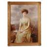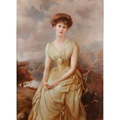 THREE QUARTER LENGTH PORTRAIT OF AN ELEGANT LADY ABOVE A LAKE