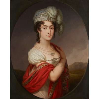 HALF LENGTH PORTRAIT OF A YOUNG LADY WITH RED SHAWL AND WHITE LACE BONNET WITH FEATHERS