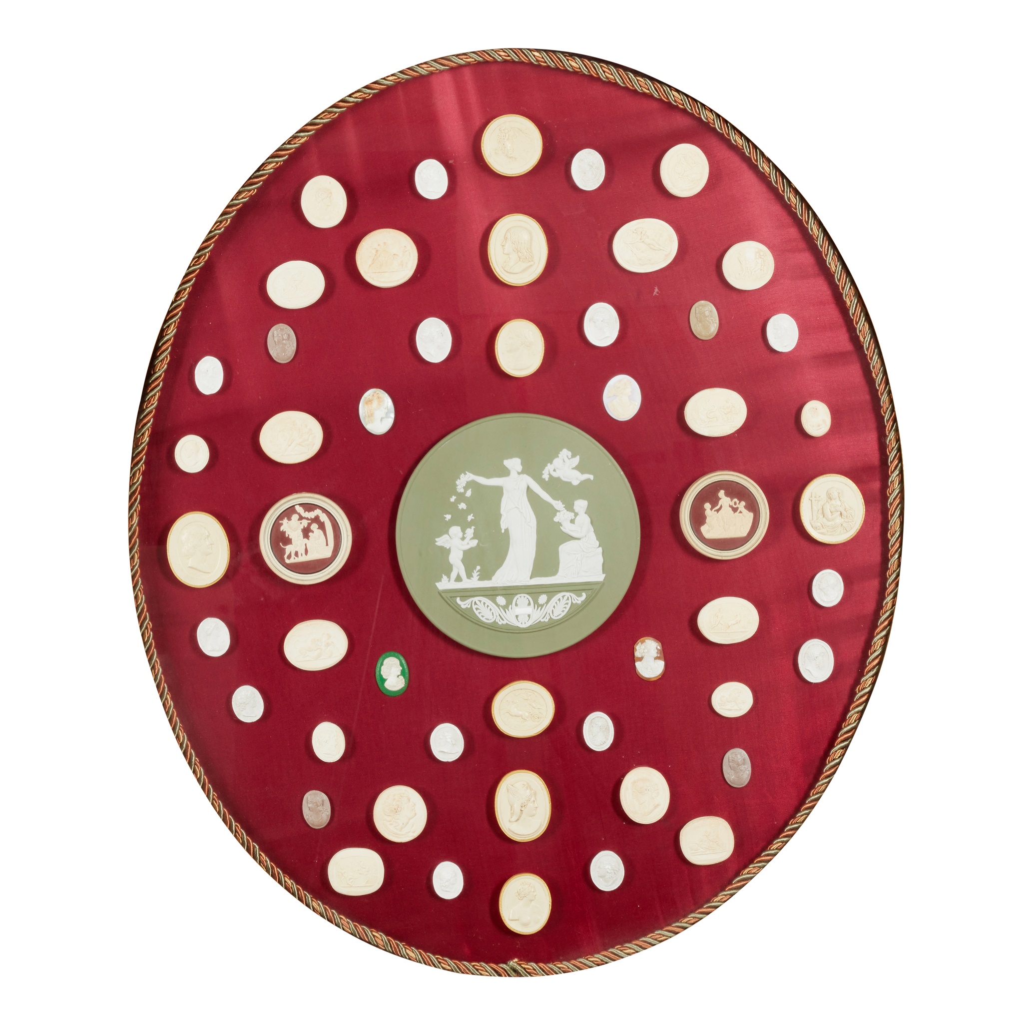 centred by a jasperware plaque, mounted on red silk in an oval gilt frame, fifty one in total