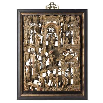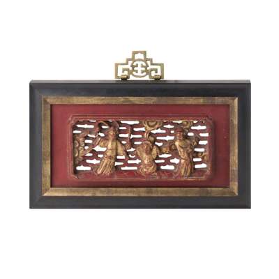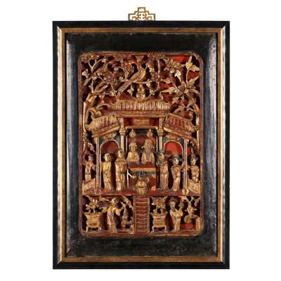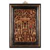 comprising: a panel carved with a man kneeling before two figures under a plaque readING 'Man Tang Fu' - abundant prosperity; a panel carved in high relief with revolutionary figures in towers; the smallest carved with three operatic figures