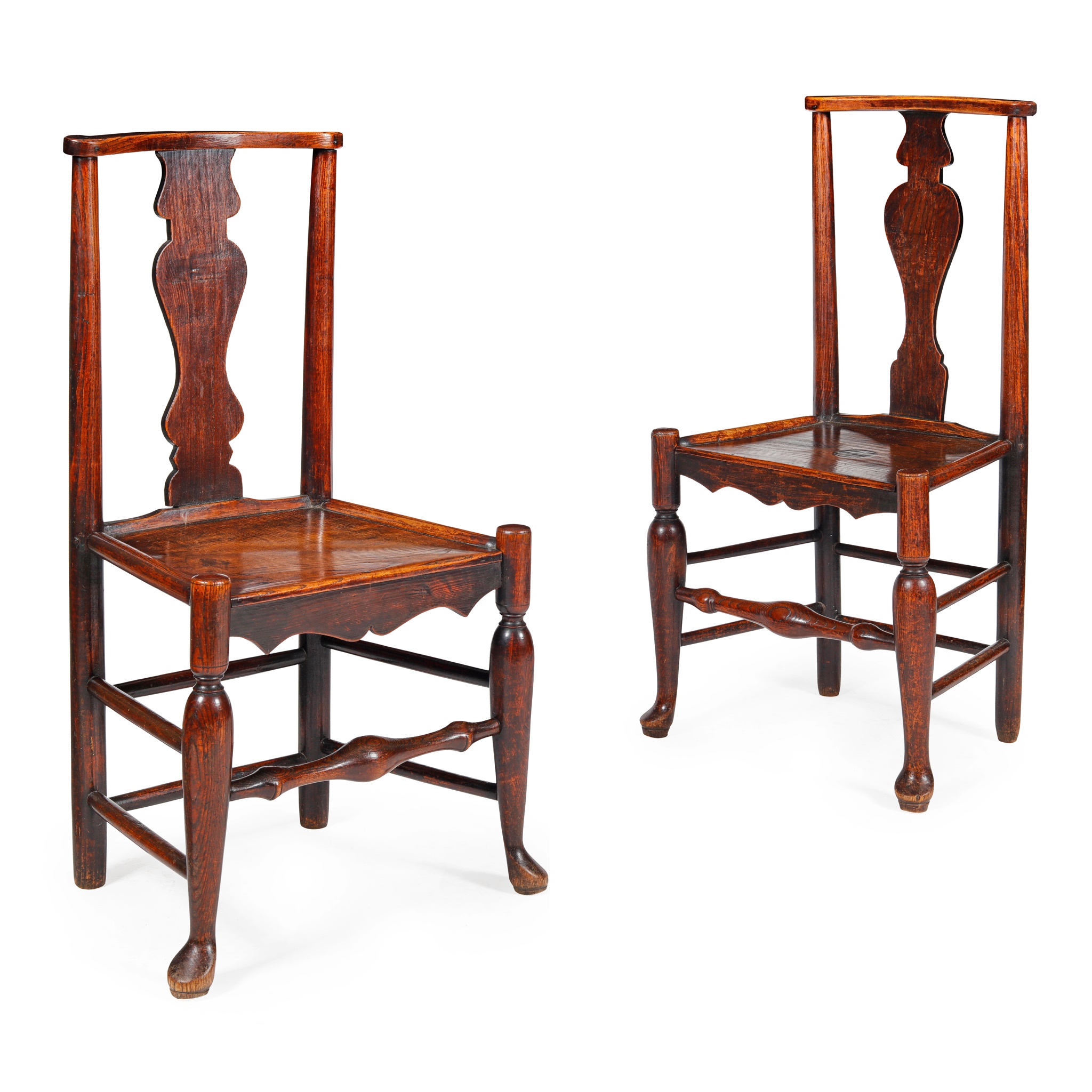 probably Staffordshire, with yoke toprails, shaped splats, framed seats, with a shaped apron on ring turned legs on pad feet feet joined by stretchers