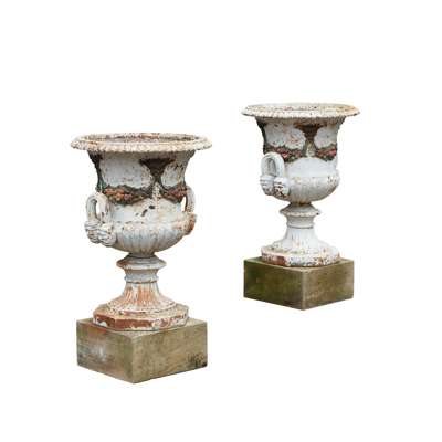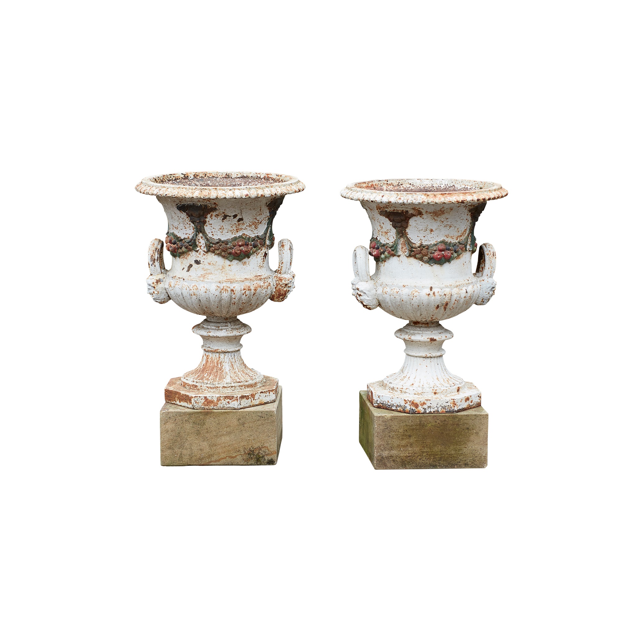 PAIR OF WHITE AND POLYCHROME PAINTED CAST IRON URNS