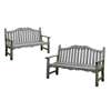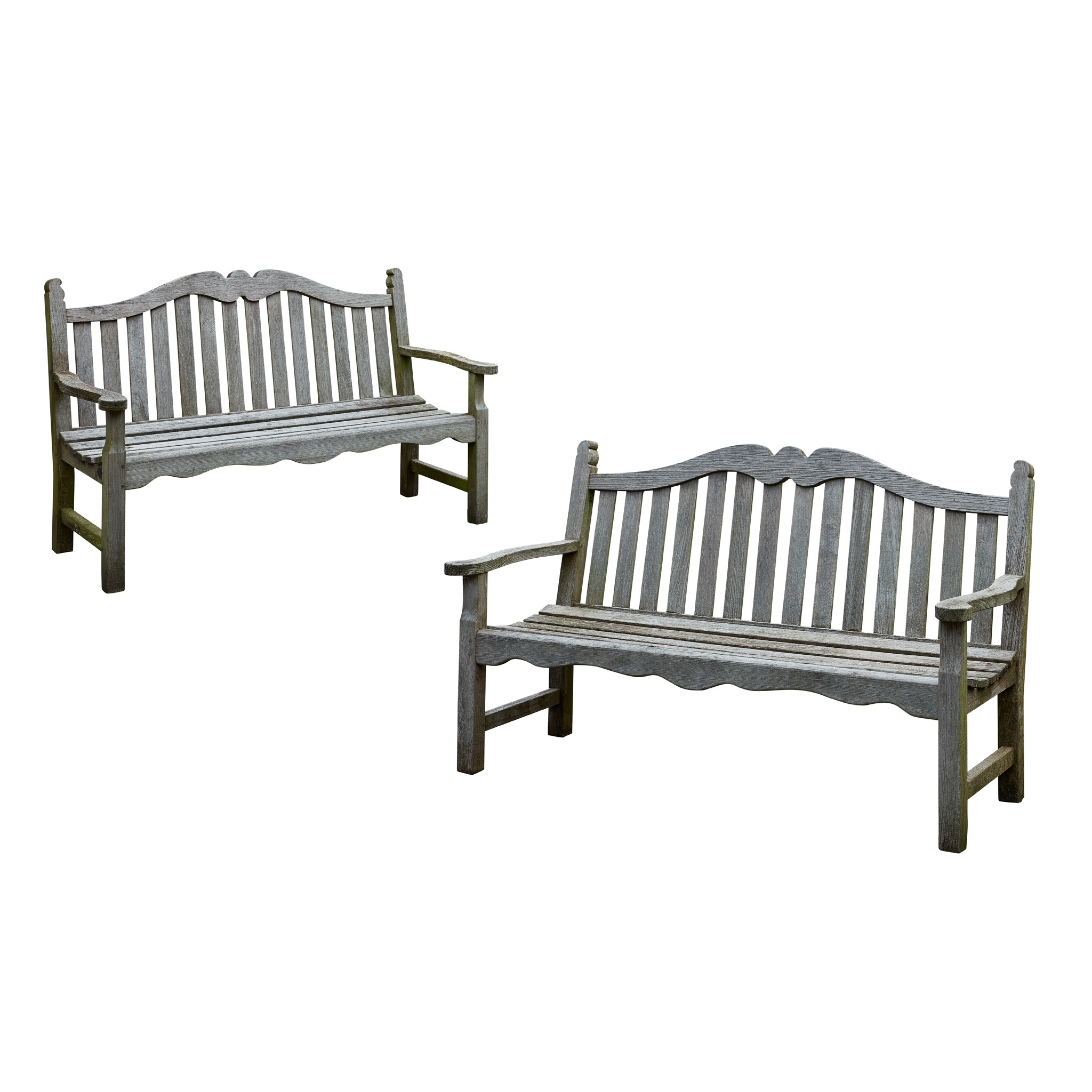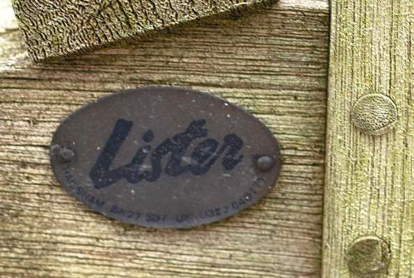 each with arched back, slatted seat, outswept arms, raised on legs joined by stretchers, bearing label 'Lister'