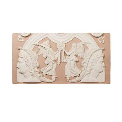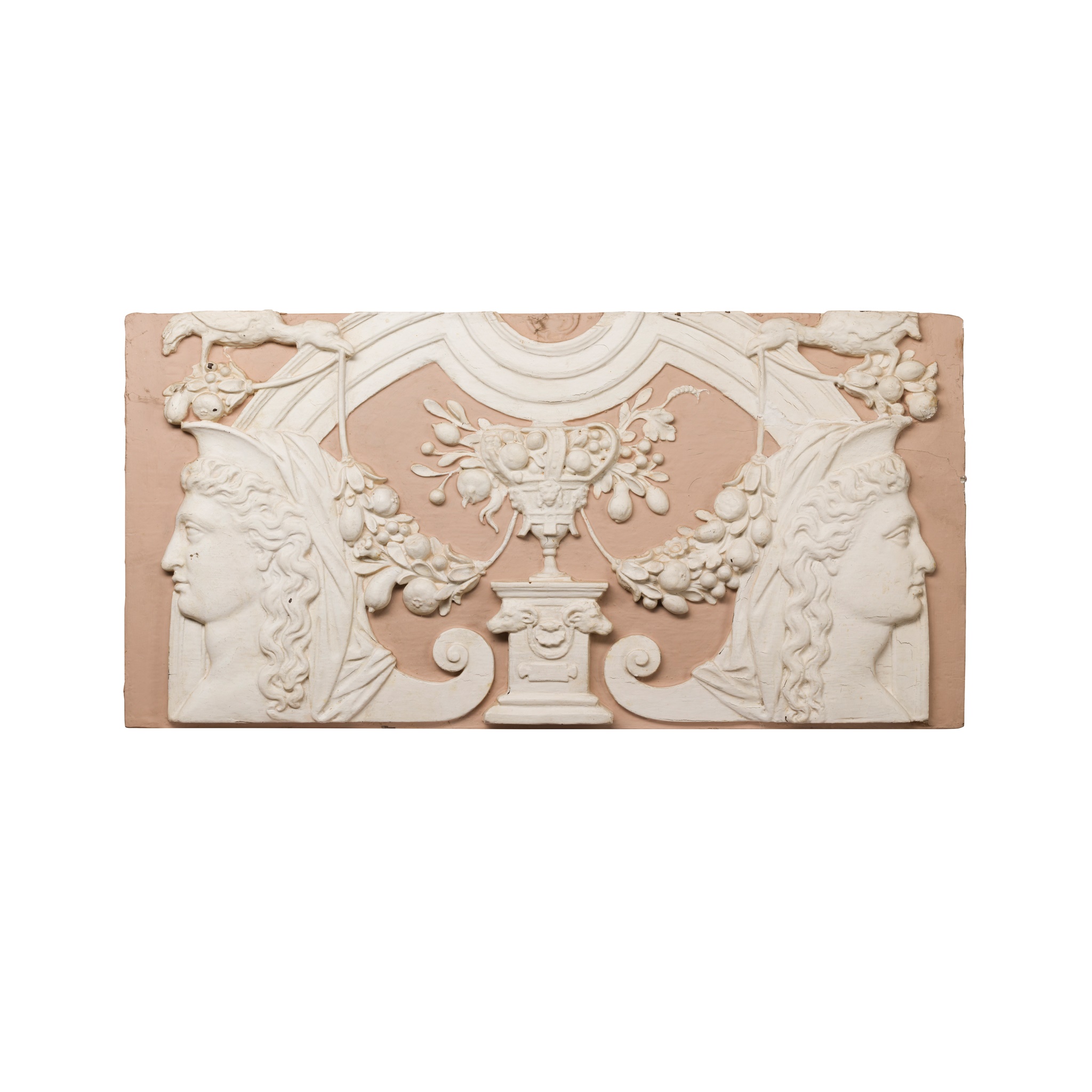 THREE CARVED AND PAINTED WOOD AND PLASTER PLAQUES