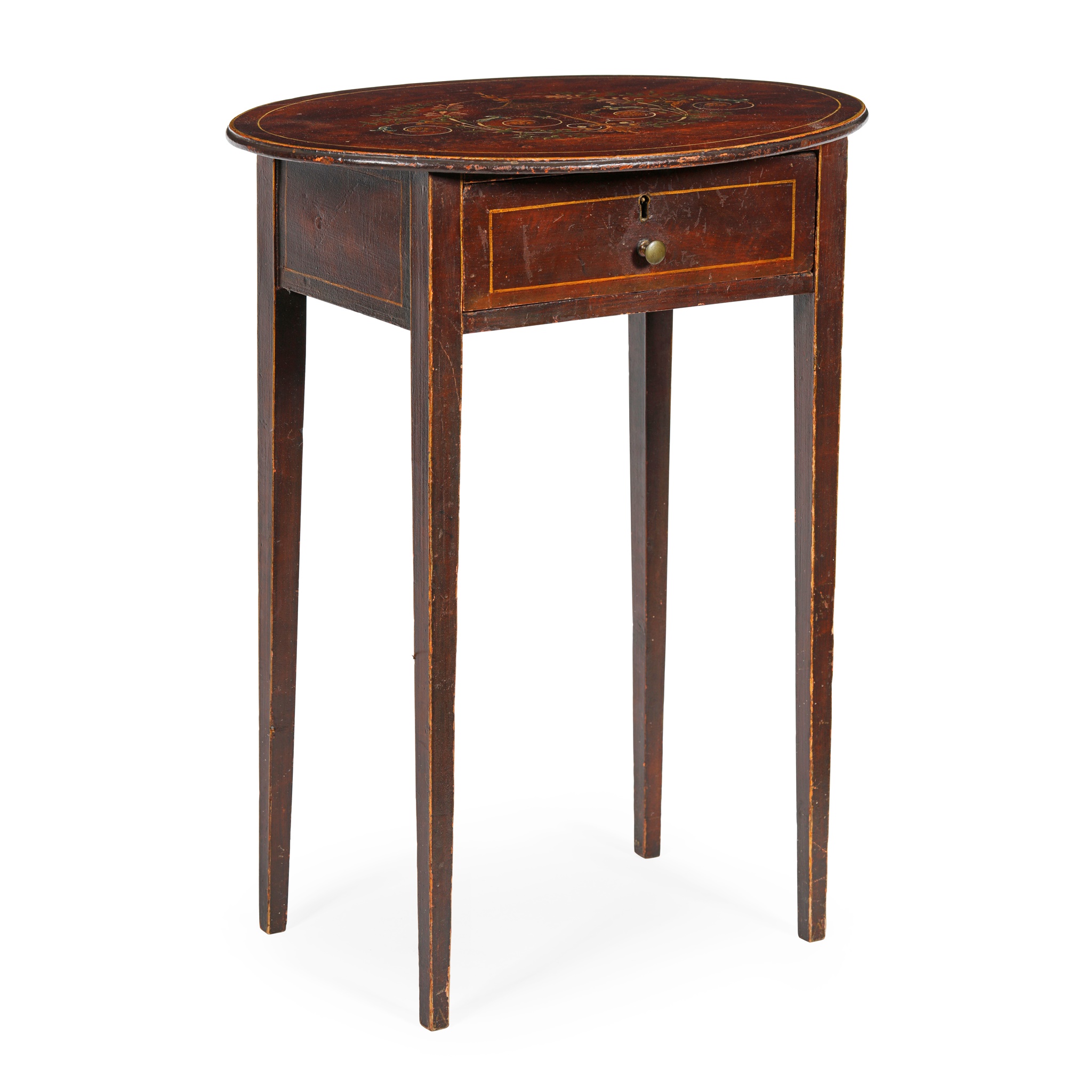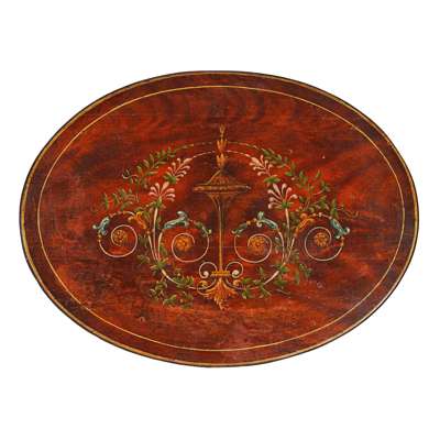 the oval top decorated with a central urn surrounded by scrolling foliage, with a frieze drawer on square tapering legs