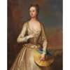 THREE QUARTER LENGTH PORTRAIT OF A LADY IN WHITE HOLDING A STRAW BONNET