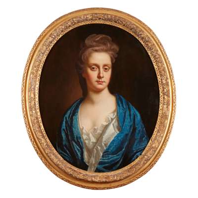 HALF LENGTH PORTRAIT OF A WOMAN IN BLUE AND WHITE DRESS