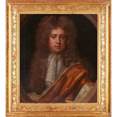 HALF LENGTH PORTRAIT OF A GENTLEMAN IN A WIG, WITH GOLD CLOAK AND LACE CRAVAT
