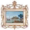 depicting a river scene, in giltwood frame surmounted by anthemion, with trailing foliage, enclosing marginal plate
