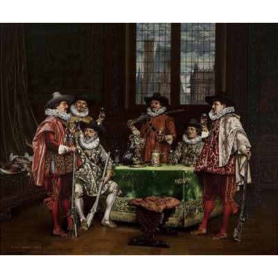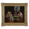 Note: 'Figures in an Interior' is a typical work by Lesrel. The balanced interior composition with a window out to the city sets the scene for the main focus of the picture, the group of figures, which allows the artist to demonstrate his talents in the highly detailed depiction of their luxurious clothing, accessories and accoutrements. From sumptuous silks and velvets swathed across the figures and the background to sparkling silver objects and weapons, even a collection of dead game to the far left, every element of the composition contributes to the feeling of richness and excess, a tribute to Lesrel's skill and attention to detail.