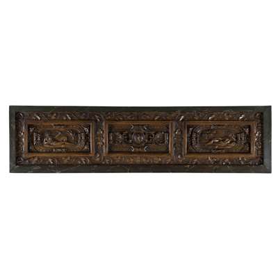 with three relief carved panels depicting an armorial cartouche flanked by reclining female nudes, within a briony leaf border