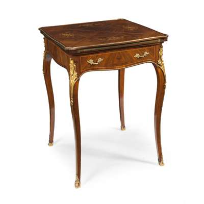 in the Louis XV style with gilt metal mounts, the fold open top enclosing a baize playing surface, above a single frieze drawer, raised on cabriole legs ending in sabots