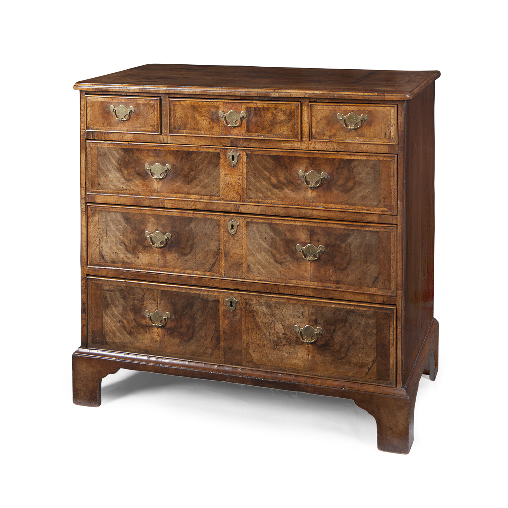 A GEORGE I WALNUT FEATHERBANDED CHEST OF DRAWERS