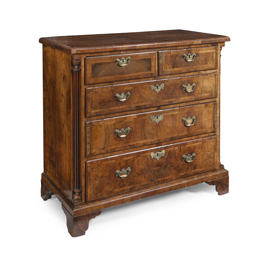 A GEORGE I WALNUT AND FEATHERBANDED CHEST OF DRAWERS