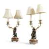 each cast with the figure of a putto holding aloft twin scrolled branches on marble plinths (2)
