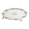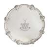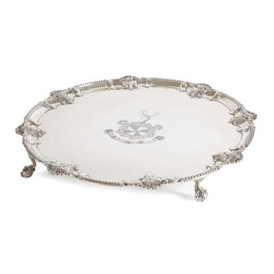 with a shell and bead cast rim, raised on four claw and ball feet, engraved with an armorial crest under a stag's head and motto 'PRO ARIS ET FOCIS'