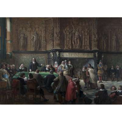 THE TRIAL OF ARMAND VAN DER VELDE IN THE HALL POF JUSTICE IN BRUGES Signed and dated 1881, watercolour