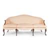 in the French style, the padded serpentine back curving to enclosed moulded arms over a loose triple cushion seat, raised on leaf carved cabriole legs with foliate carved scroll toes, in pale peach upholstery