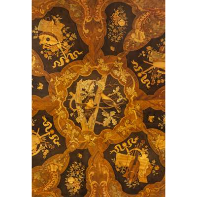 the circular top inlaid with various stained and figured woods with cartouches depicting musical trophies, songbirds, and floral bouquets within bands of scrolling foliage and vines, raised on a carved pedestal support on a tripod base with foliate carved scroll legs with ceramic castors