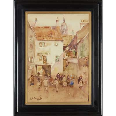 Watterston Herald painted predominantly in watercolour, working in a very 'wet' banner to create atmospheric blots and puddles, within his evocative depictions of rainy city streets, urban parks at dusk, local harbours full masts and the idiosyncratic architecture of the local towns. As an accomplished Scottish watercolourist, Herald is often compared to Arthur Melville, yet his wet technique is quite different and his colours softer and more imaginative, with a restraint, transparency and distinctive palette that is often unrelated to nature.