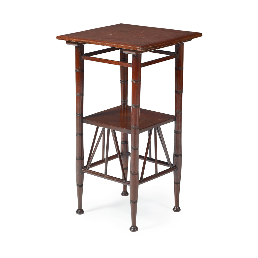 with square top on ring-turned legs linked by a lower tier with spindle gallery