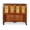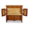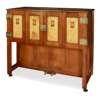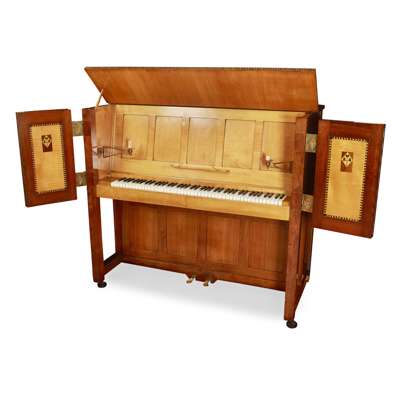 Note: Ashbee's deliberately unconventional furniture designs after 1900 particularly focused on his designs for pianos. Both his wife and his mother were talented pianists and besides, 'artists and architects of advanced tastes had been interested in reforming the design of piano cases for some time'. Burne-Jones, with W.A.S. Benson, had produced a design in 1879 which replaced the deep curves and massive legs of the high Victorian era with a treatment closer to late 18th century harpsichords and these 'Reformed' or 'Artistic' forms provoked 'steady interest' from then onwards. Ashbee's first design was for his wife Janet in 1900 and was 'shocking' in its subversion of convention. The design of this upright piano takes as its origins the ‘Manxman’ piano designed by Baillie Scott exhibited at the Arts and Crafts exhibition of 1896. Scott didn’t favour a projecting keyboard and so enclosed it with a cupboard, with ‘boldly hinged doors’, getting the idea from an Elizabethan strongbox. This design appealed to Ashbee’s interest in the unconventional and a series of inlaid cases were designed by him and made by the Guild of Handicraft for firms like Broadwood and Strohmenger who specialised in ‘specials’. The current sophisticated and luxurious design for Strohmenger & Sons has the lozenge as its central decorative device, is inlaid with panels of leaves (also painted on the iron frame), and with hinges cast with flowering plants, all familiar motifs. A similar example of a piano by Ashbee of this form is held by the National Trust at Standen House.