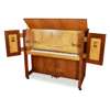 with overstrung iron frame, no. 10275, the whole with chequer and chevron banded decoration, the double hinged lid above hinged panel doors each inlaid with opposed lozenges, marquetry-inlaid with leaf sprigs, and set with brass hinges with corresponding opposed cast decoration, the interior with panelled back and keyboard of seven octaves, music stand and pair of adonised copper hanged candle sconces, the whole raised on square supports