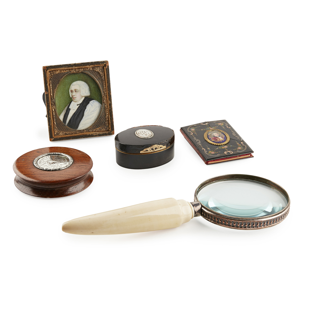 comprising a PORTRAIT MINIATURE of a cleric on ivory, 7cm high; a papier-mâché AIDE MEMOIRE depicting Bonnie Prince Charlie, with metal C-scrolls and flowers, 9.5cm high; a silver and marine ivory MAGNIFYING GLASS, by Alfred Biggin & Son, maker's marks GHB, hallmarks Sheffield 1909; a tortoiseshell PATCHBOX of oval form depicting plaited hair and the monogram HJ, 7.5cm wide; and a William IV silver mounted oak SNUFF BOX, with inset plaque THIS SNUFF BOX WAS MADE / FROM THE REMAINS / OF THE CHOIR / OF / YORK MINSTER / DESTROYED BY FIRE / FEB. 2ND 1829., 9cm diameter (qty)