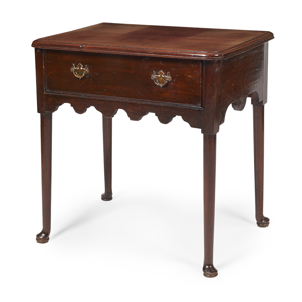 the moulded rectangular top, above a single drawer with brass handles and a shaped apron, raised on straight legs and pad feet